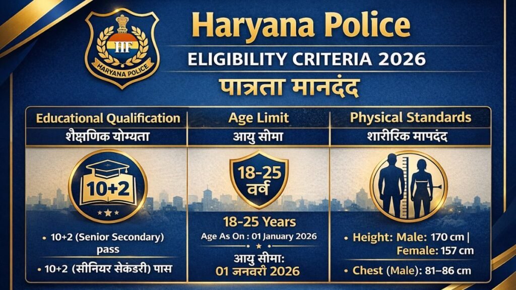 अगर आप Haryana Police Constable Recruitment 2026 में आवेदन करना चाहते हैं, तो यह article आपके लिए है। इस guide में आपको posts details, eligibility, age limit, application process, selection process, important dates, salary और FAQs step-by-step सरल भाषा में मिलेंगे।